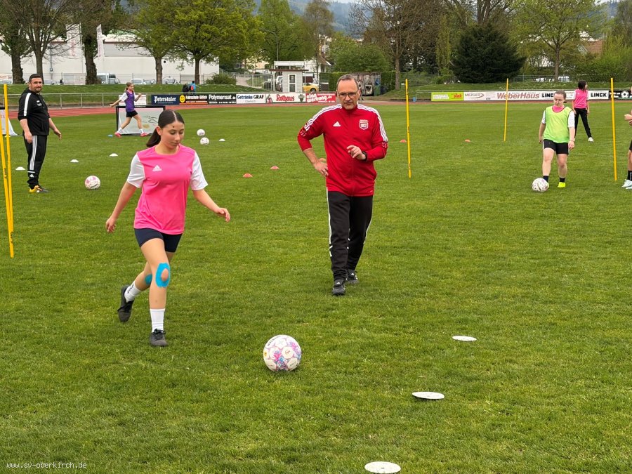 AOK Treff Fußball Girls gestartetErfolgreicher Auftakt für „AOK-Treff Fußball Girls“ im Renchtalstadion Oberkirch – Mit viel Begeisterung und strahlenden Gesichtern startete am 15. April 2026 im Renchtalstadion Oberkirch die neue Aktionsreihe „AOK-Treff Fußball Girls“. Insgesamt 21 fußballbegeisterte Mädchen nahmen an der Auftaktveranstaltung teil und erlebten einen besonderen Trainingstag unter professioneller Anleitung. Veranstaltet wird die Reihe vom SV Oberkirch in Kooperation mit dem Südbadischen Fußballverband (SBFV), unterstützt durch den Sponsor AOK. Ziel der Initiative ist es, gezielt Mädchen für den Fußball zu begeistern und ihnen attraktive Trainingsmöglichkeiten zu bieten. Die offizielle Begrüßung und Eröffnung übernahm der zweite Vorsitzende des SV Oberkirch, Hannes Baumann, der die Bedeutung solcher Angebote für den Nachwuchs hervorhob. Auch zahlreiche Ehrengäste waren vor Ort: Christian Hermann, Bezirksjugendwart Offenburg, sein Stellvertreter Thomas Müller sowie Dominik Hertlein als Vertreter der AOK zeigten ihre Unterstützung für das Projekt. Für das Training selbst konnten mit SBFV-Trainerausbilder Wolfgang Köninger und SVO-Trainer Salih Metin zwei erfahrene Übungsleiter gewonnen werden. Sie gestalteten ein abwechslungsreiches Programm, das sowohl technische Übungen als auch spielerische Elemente beinhaltete und bei den Teilnehmerinnen großen Anklang fand. Ein besonderes Highlight war die Ausstattung, die die Mädchen von den Sponsoren SBFV und AOK erhielten. Neben neuen Trainingstrikots gab es auch Bälle und Minitore – ideale Voraussetzungen für zukünftige Trainingseinheiten. Für den außergewöhnlichen Anlass wurde ausnahmsweise auf dem Hauptspielfeld des Renchtalstadions trainiert, was für viele der jungen Fußballerinnen ein unvergessliches Erlebnis darstellte. Auch die Eltern waren als Zaungäste eingeladen und verfolgten stolz die ersten Schritte ihrer Töchter im Rahmen der neuen Trainingsreihe, die am 22. und 29. April, sowie am 13. Mai (Änderung !!) fortgesetzt wird. SBFV Trainer Wolfgang Köninger vermittelte den Mädchen u.a. Tipps zur besseren Schusshaltung Mit diesem gelungenen Auftakt ist der Grundstein für eine vielversprechende Initiative gelegt, die den Mädchenfußball in der Region nachhaltig stärken soll.