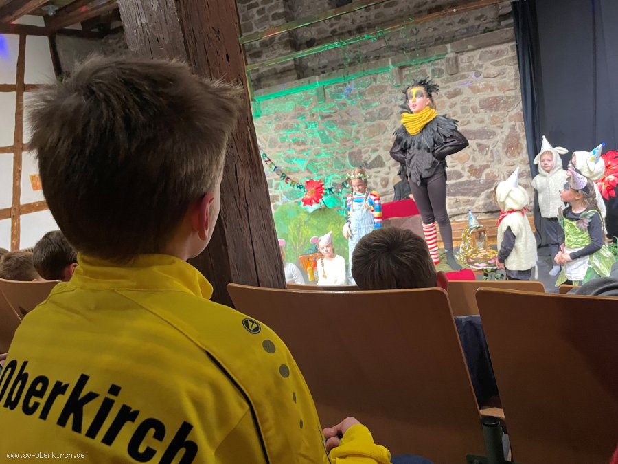 Jugendabteilung besucht Burgbühne"Der kleine Rabe Socke" zum Nikolaus Am vergangenen Freitag besuchte die SVO-Jugendabteilung mit den Kindern der Bambinis, der F-,E- und D-Jugend das Kindertheater der Burgbühne. Das besondere am Theater ist, dass es nur mit Kinderschauspielern spielt. "Der kleine Rabe Socke – Alles wieder gut“ – ist eine frech-fröhliche Geschichte vom kleinen Rabe Socke zum Thema Kranksein und Gesundwerden. Als die Mäuse alle einen Namen bekommen, will der kleine Rabe Socke auch einen. Aber so einfach ist das nicht, denn es gibt so viele verschiedene Namen, wie soll man sich da entscheiden? Der SVO-Nachwuchs kennt nun die Antwort auf diese Frage und blickt zurück auf eine sehr schöne Vorstellung der Burgbühne. Finanziert wurde der Abend aus Einnahmen aus dem Kaffee- und Kuchenverkauf der Fairplay-Spieltage unserer Jugendteams. Im Anschluss an die Vorstellung erhielt zudem jedes Kind eine kleine Nikolausüberraschung. Die SVO-Jugend zu Gast in der guten Stube der Burgbühne |